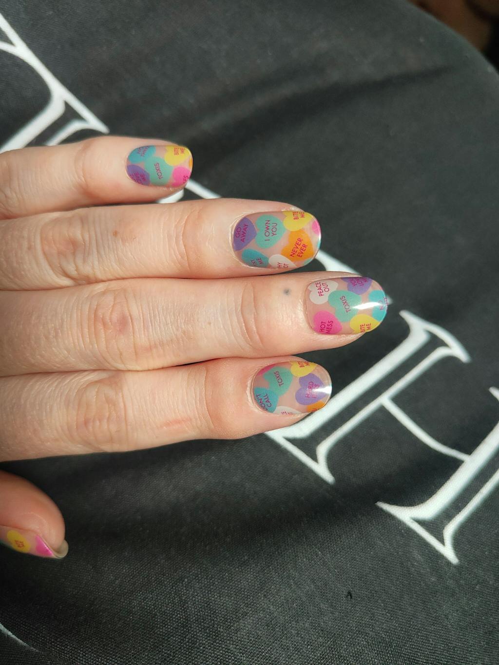 These applied well and are super cute for an anti-Valentines vibe. My only issue is the word 'Toxis' on multiple hearts, what does that even mean? Is it a misspelling of 'Toxic'? Most people probably won't notice or care probably but as a lover of the English language it confuses me greatly and if is it a misspell it's disappointing that it made it passed quality checks and into production