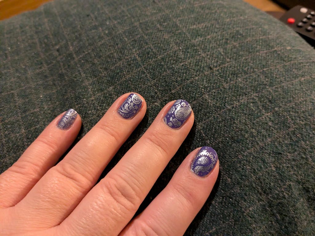 I bought this plate, planning to use it on someone else’s nails. I couldn’t resist having a go first, though. Currently my favourite plate…until the next one! The best thing about this plate, apart from the crisp printing, is that you can do a whole hand before having to clean it and restart.